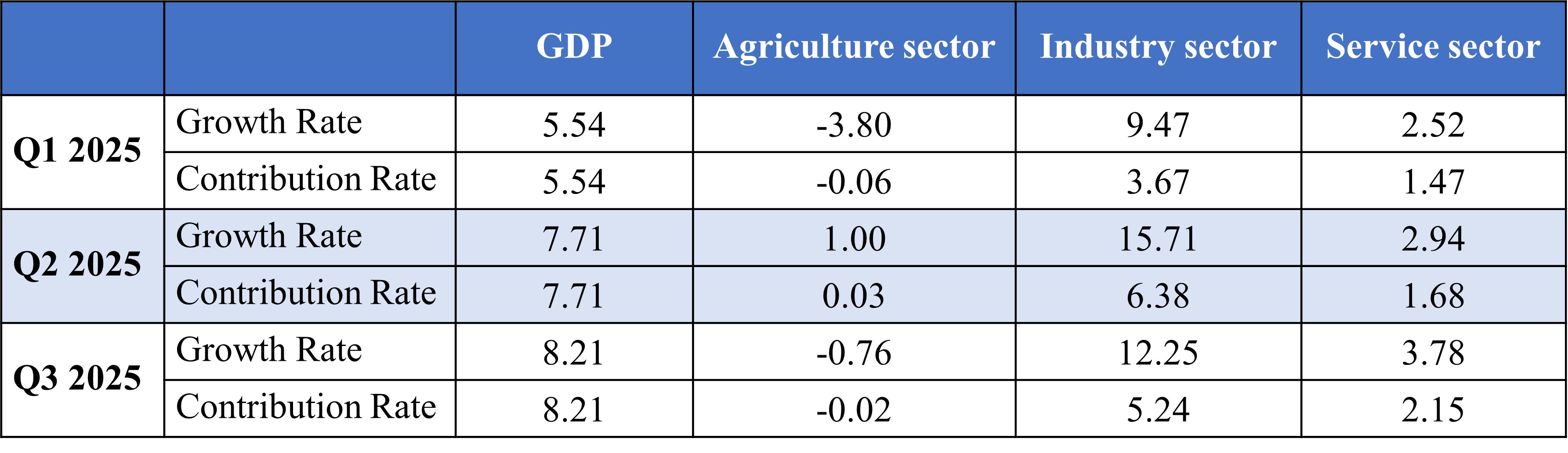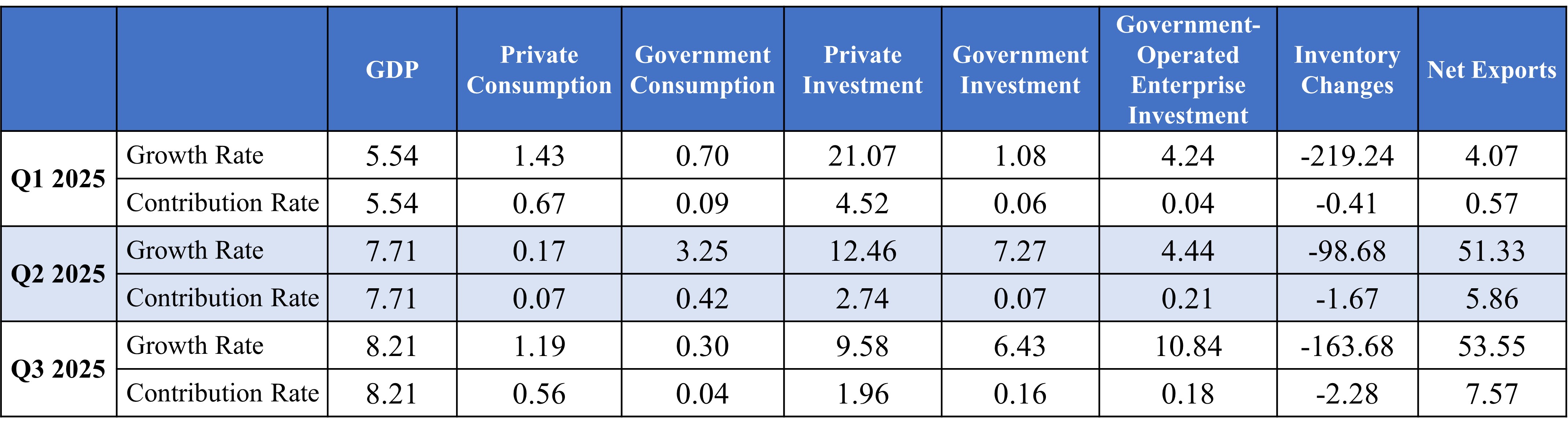 Their quarterly growth contributions were: Private Consumption: Q1: 0.67 percentage points, Q2: 0.07 percentage points, Q3: 0.56 percentage points; Private Investment: Q1: 4.52 percentage points, Q2: 2.74 percentage points, Q3: 1.96 percentage points. Net Exports, in particular, showed explosive growth, with both the growth rate and contribution continuously rising, especially in Q2 and Q3. Its growth rates in these two quarters reached 51.33% and 53.55%, respectively, with growth contributions as high as 5.86 percentage points and 7.57 percentage points. (See Table 1 below)