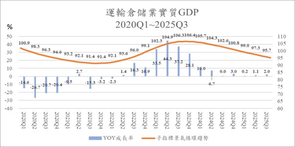Figure 3. The annual growth rate of Transportation and Storage GDP and business cycle trend, 2020Q1~2025Q3