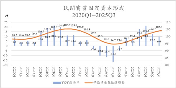 b. The business cycle trend for Private Real Fixed Capital Formation has been rising since January of last year (2024), reaching 22 months as of October this year (2025). Although the pace of ascent has slowed considerably since H2 this year compared to H2 last year, its economic condition remains robust. The actual year-on-year growth rate also turned positive from negative in Q2 2024 and accelerated quarter-by-quarter, with the growth rate in Q1 2025 even reaching 21.1%. Growth remained strong at 12.5% and 9.6% in Q2 and Q3, respectively. This holds significant positive value and meaning given the severe uncertainty arising from the current Trump-initiated tariff war. However, in the new global economic landscape of digital transformation, coupled with the long-standing structural growth imbalance in our nation, the uneven trend and resource allocation of Private Investment will generate both positive and negative feedback effects, warranting further investigation.