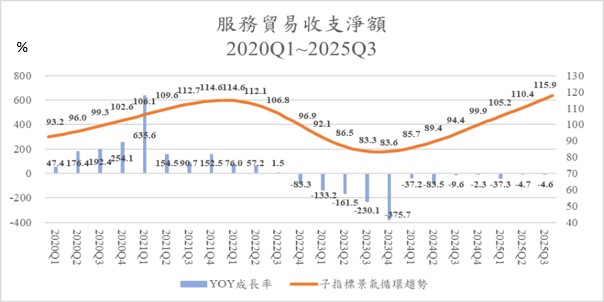 c. The Net Trade in Service Revenue and Expenditure saw a historically rare surplus during the pandemic but has now reverted to the old normal of a deficit. The deficit reappeared in Q1 2023, and its expansion continued to intensify, with the year-on-year decrease in net revenue and expenditure reaching as high as -375.7% in Q4 2023. However, it decreased to -37.2% and -83.5% in Q1 2024 and Q2 2024, respectively, and averaged -11.7% over the five quarters up to Q3 2025. The shrinking growth in the net deficit indicates that the business cycle trend value stopped falling and rebounded in October 2023, climbing from its trough of 83.28 in September to 119.66 in October this year. Due to the steep decline, the standardized business cycle variation index soared to 3.2528 Standard Deviations in October this year. Concurrently, the ratio of the services trade deficit to the goods trade surplus has significantly improved, dropping from 14.1% in the first three quarters of last year to 10.2% in the first three quarters of this year. This marked improvement in Taiwan’s overall international balance and structure contributed to a further expansion of the aggregate trade surplus, which grew by 42.4% compared to the same period.