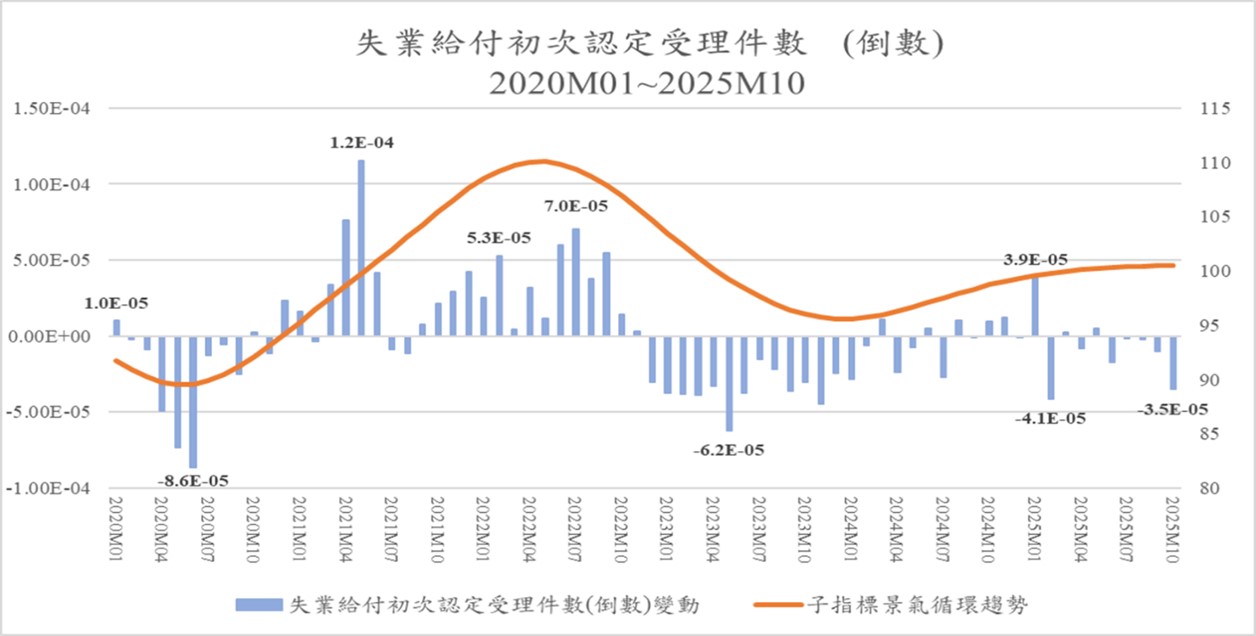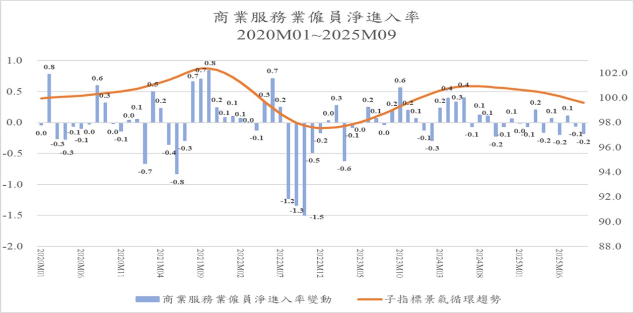 The latest statistics for the Leading Composite Coincident Index (LCCIS) indicate that, based on the government’s data for the third quarter of this year (2025), a “new downward turning point” was identified, peaking in February this year. This signifies the end of a 20-month continuous upward trend in the leading indicator’s economic cycle. The primary reason is the new “stop-rising-and-turn-down” downward trend observed in the “Net Entry Rate of Commercial Service Employees,” which had previously been continuously rising. Consequently, the balance among the 7 sub-indicators has shifted from the original 4 rising and 3 falling, to a new composition of 4 falling and 3 rising. The composite index has therefore turned from an upward trend to a downward trend.