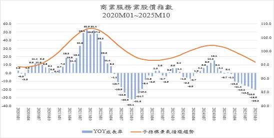 f. The downward trend in the business cycle for the Stock Price Index of the Commercial Service Industry bottomed out in April of the year before last (2023) and rebounded all the way until it peaked in September last year (2024). Since then, it has been declining for 13 consecutive months through October this year (2025), with the pace of decline slightly accelerating. The business cycle trend value has fallen to 95.94, which is below the long-term trend value (100), and the standardized business cycle variation index is now -0.7937 Standard Deviations. This indicator clearly signals the Commercial Service Industry heading towards recession and warrants close attention.