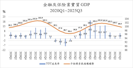 g. The year-on-year growth rate for the Real GDP of Finance and Insurance Sector started to recover growth in Q2 2023, ending four consecutive quarters of negative growth. It quickly reached a growth peak of 19.2 in Q1 last year (2024), followed by a sequential slowdown, entering single-digit growth this year (2025). Concurrently, the business cycle trend bottomed out in February 2023 and continued to rise, peaking in September last year (2024). As of October this year (2025), the cyclical index has dropped to 99.47, which is below the long-term trend value (100). The standardized business cycle variation index has also decreased to -0.3435 Standard Deviations, signaling an initial indication of a downward pull on the Commercial Service Industry, which should be closely noted.
