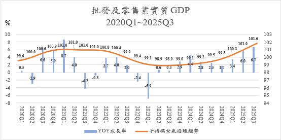 Figure 10. Annual growth rate and cyclical trend of real GDP Index of Wholesale and Retail, 2020Q1~2025Q3