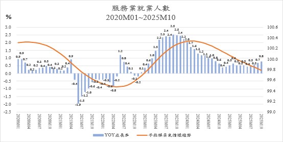 Figure 14. The growth rate and cyclical tendency of The Number of Employees in the Service Industry, January 2020 to October 2025