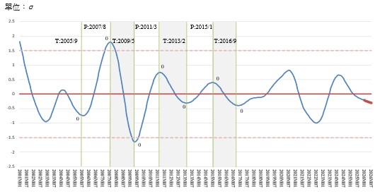 The standardized changes of the indicators’ cyclical trend values (in Standard Deviation units) are added up to become a Composite Index, and it fluctuates around the long-term trend value with a Standard Deviation of zero.