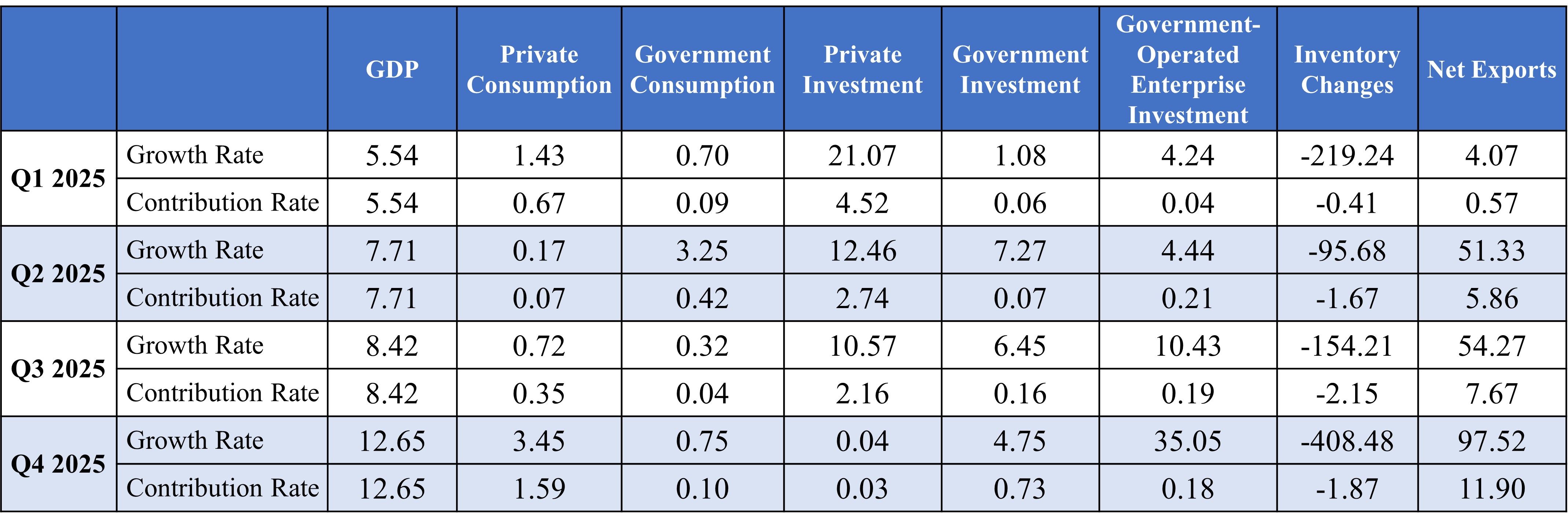 The Directorate-General of Budget, Accounting and Statistics reported that the annual economic growth rates for 2025 were: Q1 5.54%, Q2 7.71%, Q3 8.42%, and Q4 12.65%.