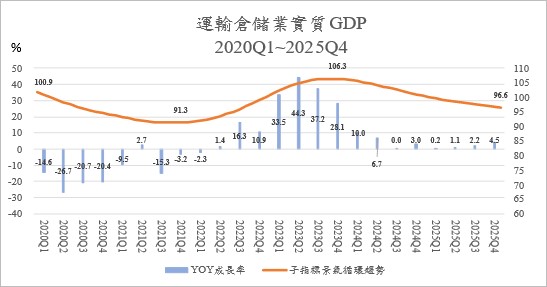 Figure 3. The annual growth rate of Transportation and Storage GDP and business cycle trend, 2020Q1~2025Q4