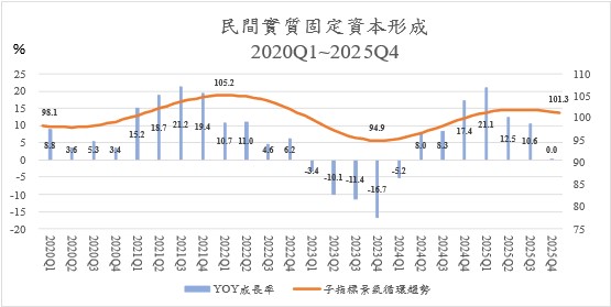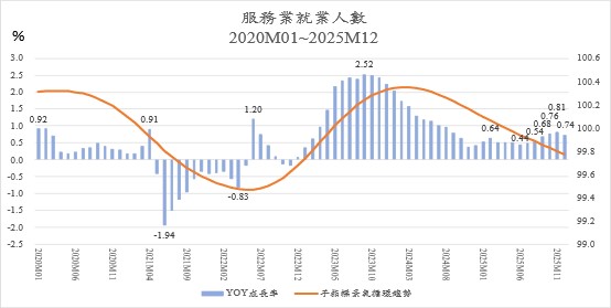 Regarding the actual annual growth rate, the sector has seen continuous growth since December 2022. The growth magnitude initially surged from 0.1% to a peak of 2.52% in September and October 2023, before decelerating to 0.4% by late 2024. Throughout 2025, the rate fluctuated between 0.44% and 0.81%, ending the fourth quarter at 0.74%. This data reflects concerns that employment growth is stagnating during the economic recovery due to intensified "labor shortage" pressures. With the cyclical trend in a continuous downward phase, no clear signs of a reversal have yet emerged.