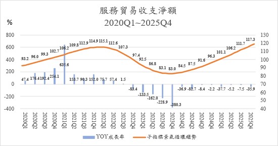Figure 5. Annual growth rate and cyclical trend of net trade in Services Revenue and Expenditure, 2020Q1~2025Q4