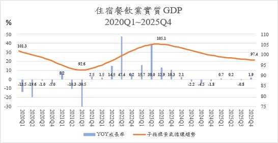 b. The cyclical trend of Real GDP of the Accommodation and Catering Industry has been declining for 30 consecutive months as of January 2026, indicating a persistent downward movement, although the rate of decline has slowed slightly. After the actual growth rate turned negative in Q2 2024, it has experienced minor fluctuations; despite a slight increase of 1.9% in Q4 2025, it failed to reverse the downward cyclical trajectory. The standardized Cyclical Composite Index continued to drop to -1.1320 Standard Deviations.