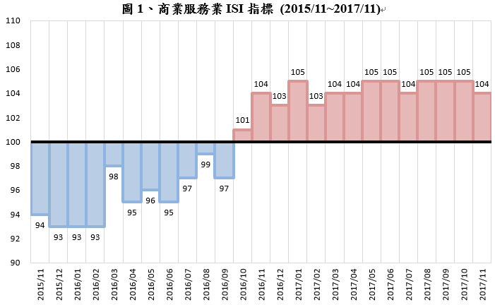 106年11月商業服務業景氣指標分數略降為104,仍維持黃紅燈